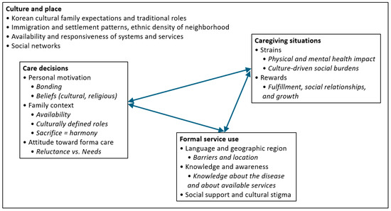 Our study applied the sociocultural model of dementia caregivers’ service use (Roberto et al. 2022) to the experiences of Korean American families. Roberto et al.’s (2022) model posited that care decisions, caregiving situations, and service use are interconnected and situated within cultural and geographic contexts. Using a qualitative lens, we applied this model to describe the culturally specific examples of the model’s constructs and generated additional themes that emerged when exploring Korean American caregiver experiences. While our findings largely coincided with the model, our findings also added cultural nuances and themes that may pertain to Korean Americans and potentially Asian Americans more broadly.