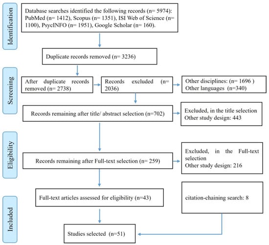 Based on the database search strategy (PubMed, PsycINFO, Scopus, Web of Science, and Google Scholar), we identified 5974 articles, out of which 1412 articles were relevant to PubMed, 1951 articles were relevant to PsycINFO, 1351 articles were relevant to Scopus, and 1100 articles were relevant to Web of Science. Furthermore, our manual search of Google Scholar identified 160 articles. After removing 3236 duplicate articles, the remaining 2738 articles were screened. Of these, 2036 articles were excluded, as they were not relevant to the study objectives; 1969 were from other academic disciplines; and 340 were in languages other than English. This left 702 potentially eligible articles. Upon further review of the titles and abstracts, an additional 443 articles were excluded, as they did not meet the study design criteria (i.e., they focused on other content or subjects). The full texts of the remaining 259 articles were then assessed for inclusion. After this detailed evaluation, 216 articles were excluded, leaving a final set of 43 articles that were included in the systematic review. We found an additional 8 relevant articles through a citation-chaining search. Consequently, in the final summary, we obtained 51 articles (Figure 1).