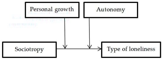 Figure 1. Conceptual model for parallel moderation. Sociotropy—independent variable, type of loneliness—dependent variable, personal growth—moderator 1, autonomy—moderator 2. - (2)