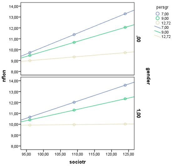 Parallel moderation in general sample. Sociotr—sociotropy; nflon—non-family loneliness; persgr—personal growth; gender 0—males, gender 1—females.