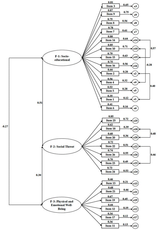 Second, factor two, called “social threat”, groups items I25, I18, I20, I22, I26, I23, I24, and I27. Finally, factor three is defined by items I13, I21, I19, I12, I17, and I11. Subsequently, the internal consistency of the global scale according to Cronbach’s alpha and McDonald’s omega coefficients was examined, indicating high reliability (α = 0.858, ω = 0.859). Specifically, high values of internal consistency were produced for factors one (α = 0.911, ω = 0.914) and two (α = 0.774, ω = 0.844) and, to a lesser extent, for factor three (α = 0.656, ω = 0.666) (Table 2). Although the reliability indices for factor three were not as strong, the reliability of the overall construct was supported by its strong internal consistency.