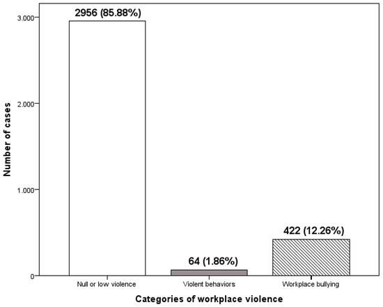 Figure 1 shows the prevalence results for the three categories of WB. There were 2956 cases of null or low violence (85.88% of the total sample), 64 cases of violent behaviors (1.86% of the total sample), and 422 potential cases of WB (12.26% of the total sample).