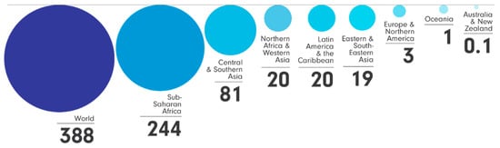 Female population living in extreme poverty, by region, 2022 (in millions). Source: UN Women, UNDP and Pardee Center for International Futures using the International Futures modeling platform ().