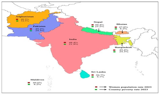As per recent UN data, the poverty rate among women in South Asia is projected to rise in 2021 due to the repercussions of the COVID-19 pandemic. This trend emphasizes that, in the next decade, a higher number of women in the 25–34 age group are expected to experience increased poverty. The impact of the coronavirus pandemic may have led to as many as 47 million women and girls falling into extreme poverty by 2021 in South Asia (). Figure 3 illustrates the female population in South Asia alongside the country poverty rate.