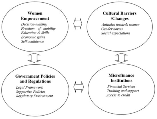 Microfinance has emerged as a critical instrument for advancing women’s economic and social empowerment, supported by various theoretical frameworks. The economic empowerment theory asserts that access to financial resources and economic opportunities enables individuals, especially women, to boost their income, stability, and overall well-being. Microfinance and similar initiatives provide the means for individuals to start or expand businesses, thus improving their economic standing (). This economic progress translates into broader social empowerment, as microfinance facilitates women’s acquisition of social status and decision-making power within their communities (). The feminist economic theory highlights the need for economic systems to address and correct gender imbalances, advocating for increased economic participation and resource access for women as a path to greater equality and empowerment. It contends that microfinance disrupts traditional gender norms by providing marginalized women with opportunities for economic involvement previously out of reach (; ). Additionally, the capability approach underscores how microfinance enhances women’s capabilities and agency, enabling them to make independent choices that enhance their quality of life (; ). Frameworks focusing on financial access and social capital stress the significance of inclusive financial systems and the role of microfinance in fostering supportive networks among women (). Collectively, these theoretical perspectives demonstrate that microfinance not only mitigates economic inequalities but also fosters social and personal empowerment for women, positioning it as a crucial element in development strategies. () further emphasizes the relationship between empowerment and poverty reduction, offering insights into how microfinance influences women’s agency.