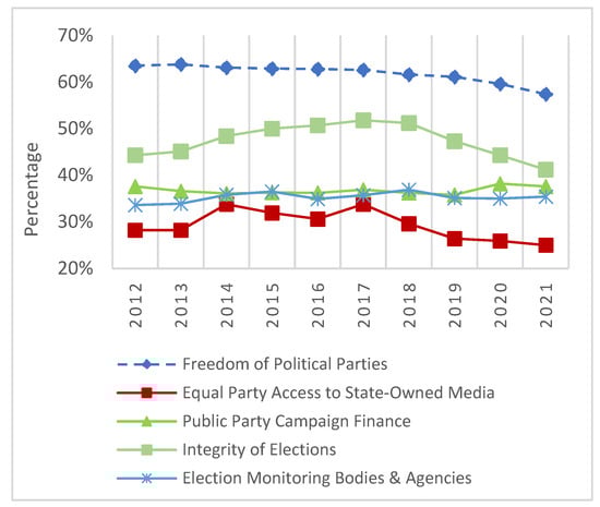 Freedom of association under the V-Dem assesses whether political parties, including opposition parties, have the right to form and engage in elections, as well as the freedom for civil society organizations to establish and operate without restrictions. It reveals a consistent decline in freedom of association in Africa (illustrated in Figure 2). Shifting to the clean election index measured by V-Dem evaluates the extent to which elections are free and fair, encompassing factors like the “absence of registration fraud, systematic irregularities, government intimidation of the opposition, vote buying, and election violence” (Coppedge et al. 2023a). Statistically, there was slight progress in the trends of clean election from 2013–2018, then a continuous decline has been observed with the lowest score in 2022. Turning to Figure 3 of the IIAG data, freedom of political parties has exhibited a continuous declining trend compared to 2012, while party campaign financing has shown slight improvement. In addition, accessibility to state owned media to opposition political parties is below 40% and has shown a declining trend from 2018–2021 (see Figure 3).