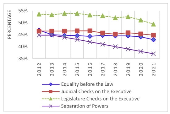 The liberal dimension of democracy encompasses the fundamental principle of safeguarding the rights of individuals and minorities to prevent potential state and majority tyranny (Coppedge et al. 2023b). This is achieved through the principle of equality before the law, strong rule of law, and effective checks and balances (distribution of power throughout a political system) implemented by the judiciary and legislature, limiting executive power. These aspects are captured by the three indices of V-Dem and four variables of the IIAG. Afro is also used to measure citizens’ perception of the frequency of unequal treatment by their government. Figure 5, Figure 6 and Figure 7 illustrate the trends of these factors over time in Africa.