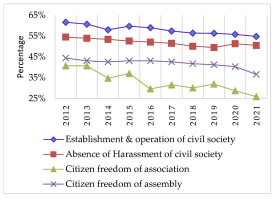 Figure 8 also indicates a substantial increase in people’s involvement in the political decision-making of their country, especially in local government. Citizens’ active involvement in local government reflects the presence of elected local governments, decentralized political party nominations, and their operational independence from unelected bodies at the local level (Coppedge et al. 2023a). The lack of citizens’ participation in regional government, as illustrated in Figure 8, is evident and arises from the non-existence of elected regional governments, substantial interference from unelected bodies, or a combination of both factors. This is corroborated by IIAG findings (illustrated in Figure 9), indicating a continuous and substantial decline in citizens’ freedom to associate and assemble freely. Freedom of association alone has reduced from 43% in 2013 to 31% in 2022. The decline in citizens’ freedom of association and assembly, along with the low level of citizens’ participation in regional government, narrows the democratic space, restricting the diversity of political voices and limiting citizens’ active participation in governance.