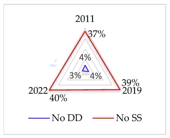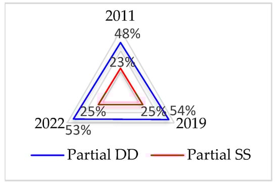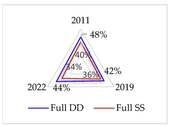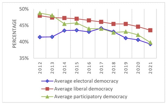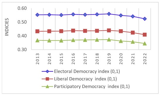 In 2013, as shown in Figure 12, the percentages for electoral democracy, liberal democracy, and participatory democracy were 41%, 48%, and 49%, respectively, with a subsequent decrease in these percentages to 39%, 44%, and 40% in 2022.