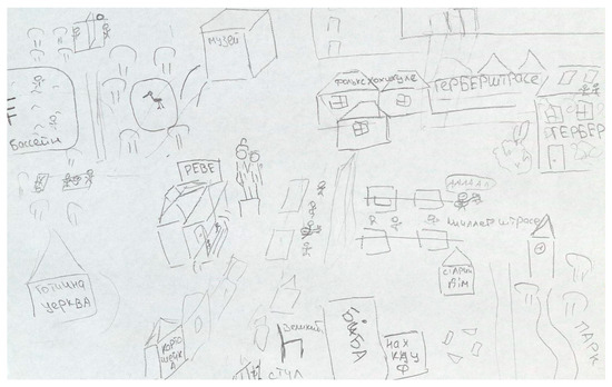 The components and techniques categorized under the NOP category include those analytics that help us to understand how the physical, remembered, and imagined space relates to the way it is perceived and lived (Gieseking 2013, p. 22) As it was mentioned above, when talking about the use of color, some participants identified districts in their drawings. One participant colored the districts according to his personal interpretation and labeled them in his own terminology, whereas another participant labeled one district Weimar-Nord with many question marks, and another part of Weimar (Weimar-West) she labeled as “this is unfamiliar to me”. Although the two latter districts have a high population of Ukrainian refugees living in them, it shows that to her they are not familiar territory.