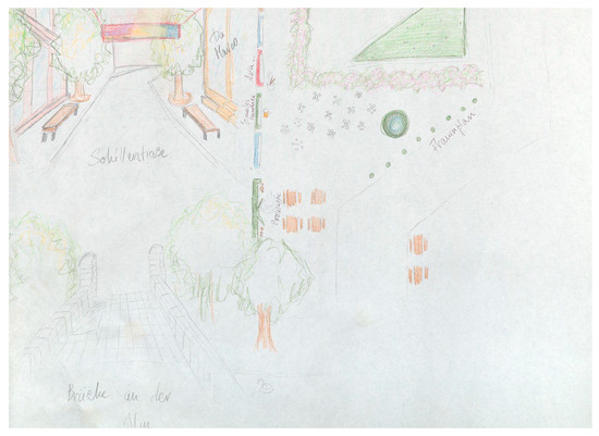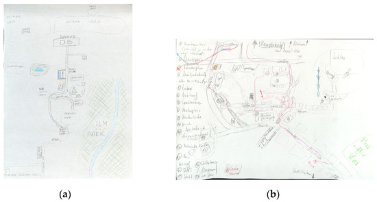 One of the most common landmarks drawn by participants was the Goethe–Schiller Monument, commemorating two of the most prominent German writers, who lived in Weimar. Located in the heart of the city, it is one of the biggest sights of the city, which one passes by regularly when one lives in Weimar. All participants engaged in drawing landmarks, e.g., museums, parks, university campus, castles, and other monuments. This also indicated that participants were very well aware of the city’s significance in German history and culture and are also active observers and users of the landmarks they drew.