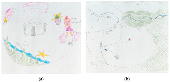 The analytical elements were selected for the examination of emotional aspects rather than for the investigation of user experiences. For this reason, in our analysis, we included new analytic elements, such as “Includes Non-Human Animals” and “Includes Activities” (Table 1), which allowed us to open a new perspective of refugee youth’s interaction with nature in the city and its effect on their mental health and sense of safety. The introduction of new analytics has enabled a more comprehensive understanding of the significance of both social and creative activities. These include, for example, the making of music in public spaces or the engagement in leisure activities at open-air swimming pools during the summer months (Figure 1). The analysis of mental maps through the aforementioned categories allowed for a detailed examination of each mental map, and then compared the data altogether to see if there are any trends in participants’ drawings.