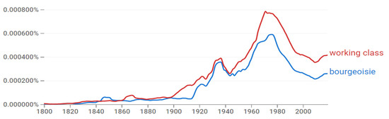 Google Ngrams graph of frequency of use of the terms working class and bourgeoisie. The Google Ngrams search engine gives a sense of the changing and growing or declining use of certain terms within 40 million books and journals. Why these changes have occurred is open to interpretation. Here the graphs are used to simply demonstrate when terms started to be used in books and when and by how much the use of terms has increased or decreased.