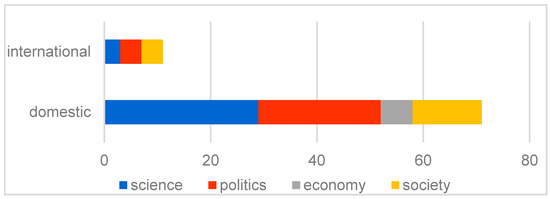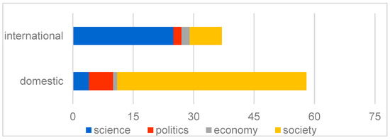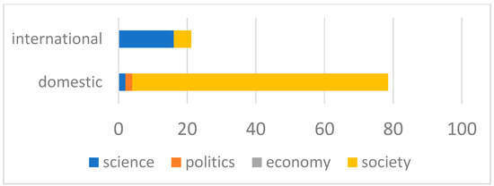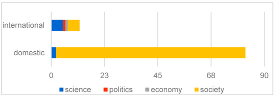 Out of 287 Turkish news articles that have been included in this research, two hundred belong to Domestic: Social, eight belong to Domestic: Science, eight belong to Domestic: Politics, one belongs to Domestic: Economy, eighteen belong to International: Social, forty-six belong to International: Science, three belong to International: Politics, and three belong to International: Economy. The most important is given to the Domestic: Social, while the second is the International: Science and the third is the International: Social. It can be understood that as the number of domestic topics is very high, the following topics are highly related to the international dimension of COVID-19.