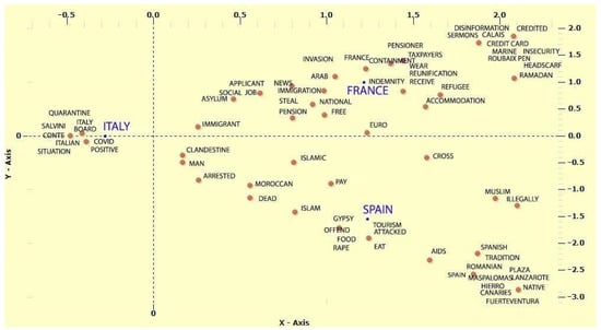 The second factor (abscissa axis), on the other hand, explains how these stereotypical features of the Spanish (quadrant number 4) and French (quadrant number 1) racial hoaxes are opposed to and, thus, differ from, the Italian (quadrant number 2/3) context, since they are strongly associated with the immigrants’ lack of physical competence in pandemics. In fact, in this factor, we could not find lemmas such as COVID-19, quarantine, and positive situations, as well as national political situations such as Salvini, Italia, and Conte.