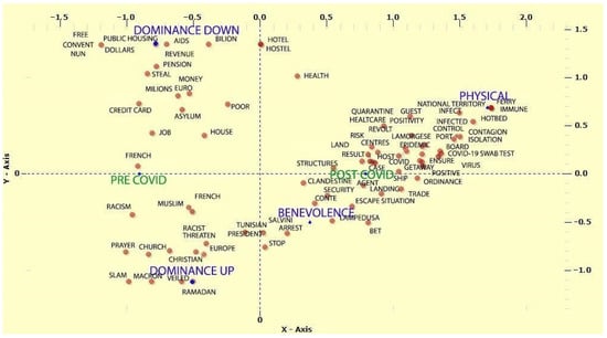 From the first factor (ordinate axis) emerged stereotype contents that seemed to oppose, on the one hand, the stereotypical dimension of agency, particularly the lack of physical competence (quadrant number 1) and dominance down (quadrant number 2), with terms such as infected, positivity, infect, infection and epidemic, or aid, income, free, pension, credit card and poor, respectively; and, on the other hand, the dimension more linked to the social relations of lack of benevolence (quadrant number 4) and dominance up (quadrant number 3), associated with words such as security, arrest, stop and escape or Islam, Ramadan, church and Christian, respectively. In the first case, immigrants are stereotypically seen as carriers of disease or portrayed as individuals lacking opportunities, benefiting at the expense of others, as parasites do, and in the second case, immigrants are described as individuals who challenge national safety or the societal religion or culture.