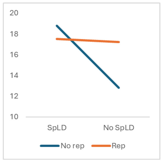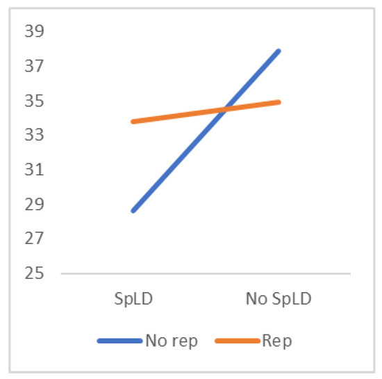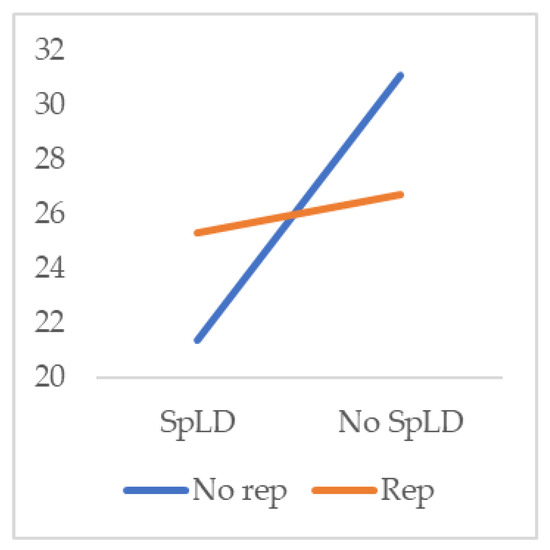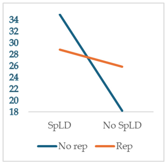 Regarding the variable of self-esteem (see Figure 3), we see that SpLD has a significant effect, since the slope of the resulting line is notable. However, educational measures are not as relevant, presenting a practically horizontal line. Nonetheless, since the two lines intersect, a significant interaction appears when both factors combine. This indicates that students with SpLD who are not held back a school year have lower self-esteem than those with SpLD who do repeat a year.