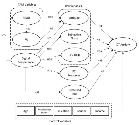 - Abdullah, Fazil, and Rupert Ward. 2016. Developing a General Extended Technology Acceptance Model for E-Learning (GETAMEL) by analysing commonly used external factors. Computers in Human Behaviour 56: 238–56. [Google Scholar] [CrossRef]