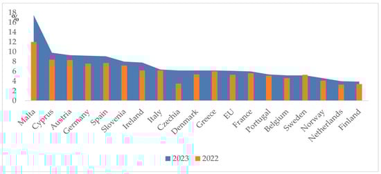Share of third-country nationals in the total population for selected European countries and the EU, 2022–2023. (Source: Authors’ elaboration with data from Eurostat’s and the European Migration Network’s Annual Report on Migration and Asylum for 2023 and 2024.).