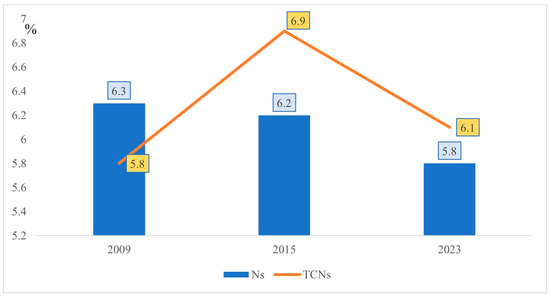 Shares of third-country nationals (TCNs) and nationals (Ns) aged 20–64 reporting being in a bad or very bad state of health across the EU-27 for the years 2009, 2015, and 2023. (Source: Authors’ elaboration with data from Eurostat).