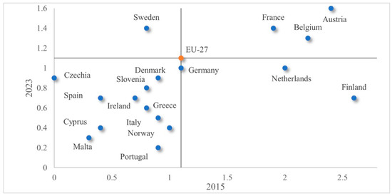 There are marked differences in health status between immigrants and nationals across EU countries (see: Eurostat 2024a). For example, the upper right quadrant shows EU member states—Austria, France, and Belgium—where TCNs report being in worse health than nationals both for 2015 and 2023. Moreover, in 2015, the self-perceived health of TCNs was more than two times worse than that of nationals in three member states: Finland (2.6), Austria (2.4), and Belgium (2.2). However, in 2023, the ratio in almost all countries shows moderate values (all below 1.4), indicating that the gap in certain cases became narrower.