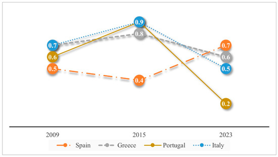 In Figure 4, we examine the ratio between the share of TCNs and Ns in bad or very bad self-perceived health for Greece, Italy, Portugal, and Spain for the years 2009, 2015, and 2023. Interestingly, at all three time points (2009, 2015, and 2023) in all countries with a truncated welfare state, the percentage of TCNs who reported being in very bad or bad health was very low. Although all European countries have welfare programs, there are clear cross-national differences with respect to their design and generosity. These differences are reflected in variations across countries in terms of poverty rates and, of course, unemployment rates and employment conditions, especially among TCNs; employment conditions which, to a greater or lesser extent, can be linked to health.