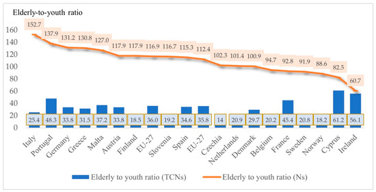 Elderly-to-youth ratio for third-county nationals (TCNs) and nationals (Ns) for selected European countries and the EU-27, 2023. (Source: Authors’ elaboration with data from Eurostat.).