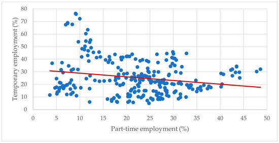 Share of part-time and temporary employment for TCNs aged 20–64. (Note: The data pertain to 18 countries for 2009–2023 and were procured from Eurostat. The red line is the trend line, blue points are country observations).