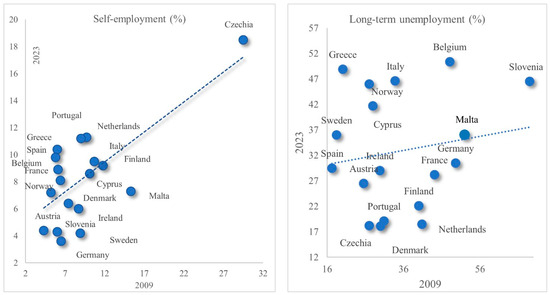 Share of self-employed TCNs without employees and long-term unemployment (%) among TCNs aged 20–64 in 2009 versus 2023. (Source: Authors’ elaboration with data from Eurostat. The blue line is the trend line, blue points are country observations).
