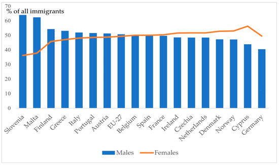 The situation is rather different when examining the employment rate among females. In all countries, with the exception for Malta, females who are also country nationals have higher employment rates than females who are TCNs. The differences between the two groups (Ns-TCNs) of females (aged 20–64) are impressive. The largest gaps were recorded in Sweden (32.1 percentage points [pp]), Germany (33.2 pp), Belgium (31.3 pp), the Netherlands (27.6 pp), Finland (27.2 pp), France (25.2 pp), and Austria (21.7). Across the EU-27, the difference was 20 percentage points. Moreover, the employment rate differences between male and female TCNs were also remarkable and in favor of males. The gap was narrower in Malta (only 8.6 pp higher for males), but it was over 25 pp in Germany, 25.5 pp in Sweden, 29.6 pp in Slovenia, 32.4 pp in Italy, and 40.0 pp in Greece (Figure 10).
