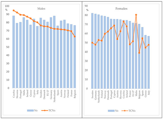 Employment rate for country nationals (Ns) and third-country nationals (TCNs) by sex 2023. (Source: Authors’ elaboration with data from Eurostat.).