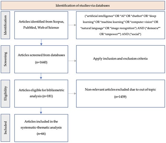 (“artificial intelligence” OR “AI” OR “chatbot” OR “deep learning” OR “machine learning” OR “computer vision” OR “natural language” OR “image recognition”) AND (“democra*” OR “empower*“) AND (“social”)