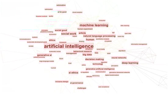 Keyword analysis was used to observe the emerging studies in research related to AI and social good. A total of 212 keywords from 2015 to 2024 were identified. A visualization of a co-occurring keyword network was obtained and is shown in Figure 2. Each label represents a keyword. The co-occurring frequency of the keywords determines the label size. The results show that “artificial intelligence”, “machine learning”, “human”, and “social work” are the most frequent keywords to appear in AI and social good studies. The “artificial intelligence” and “machine learning” keywords generate a high betweenness centrality value, as shown in Table 8, indicating that those keywords highly influence AI and social good studies. Figure 3 visualizes the clusters of keywords with similar terms, revealing eight distinct groups.