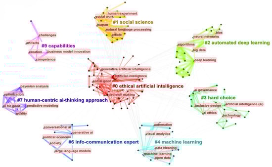 - Cluster #0 Ethical Artificial Intelligence. This cluster, comprising 50 members, occupies a central position. The most cited keywords are “artificial intelligence”, “decision making”, “social good”, “ethics”, and “generative artificial intelligence”. Most of these keywords were cited in the studies related to ethics in artificial intelligence (covered in Astobiza et al. 2021; Keller and Drake 2021; Moore 2019; Nasir et al. 2023; Sreenivasan and Suresh 2024).