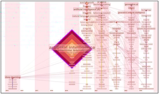 The formed clusters reflect the sub-field of AI related to social studies. Each formed cluster consists of keywords representing the cluster’s topic. Figure 4 shows a visual representation of the evolution from deep learning to artificial intelligence, generative AI, and ethics, highlighting keywords reflected in the literature from the recent decade. In 2024, keywords such as “technology”, “management”, “smart city”, “user acceptance”, “social media”, and “conversational AI” emerged. To further explore recent research trends and frontiers in AI for social good, we present the burst intensity of keywords, along with their start and end times, in Table 9. The focus within the AI for social good domain has shifted to neural networks and ethics, with neural networks garnering attention earlier than ethics. These two topics represent the emerging trends currently shaping the field of AI for social good.
