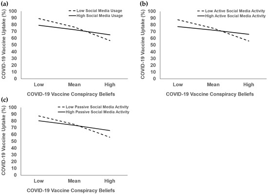 3.3. Aim 2: Testing Associations Between COVID-19 Vaccine Conspiracy Beliefs and Vaccine Uptake and Moderation by Social Media Use and Behaviors