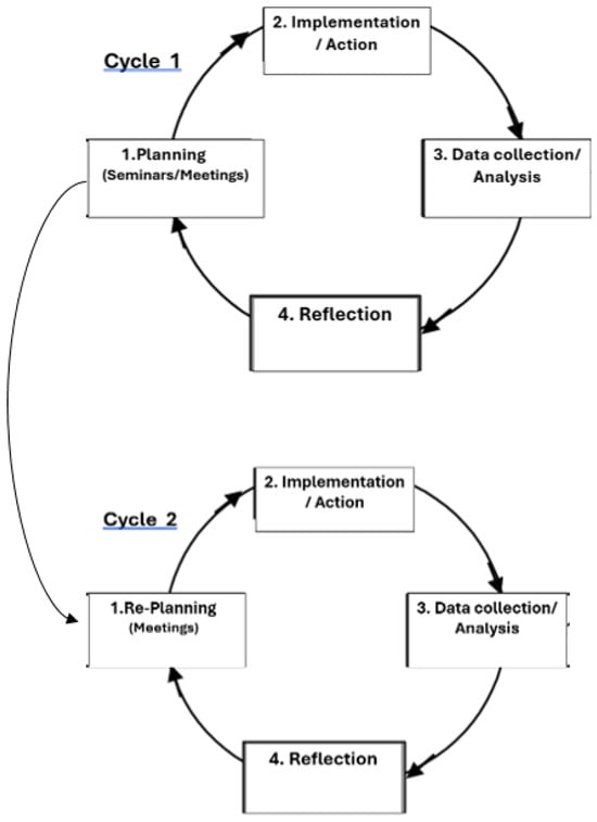 Action research follows a cyclical process that develops in a spiral manner, beginning with a specific starting point (e.g., a topic or question for investigation) and culminating in the presentation and dissemination of new knowledge (). According to (), each action research cycle consists of distinct stages: designing an action (in this case, a teaching intervention using an action hypothesis), implementing it in practice, systematically observing the process and reflecting on the action. This reflection then leads to a revised plan, following our recent program regarding the cycle (Plan–Act—Select data and analyze–Reflect–Re-plan and so on). Specifically, the stages of our collaborative action research were a. seminars conducted by the researchers and planning of the theme by the educators, b. implementation/taking action (by the educators), c. collection and analyzing data (by the educators and the researchers) and d. reflection (between researchers and educators in the distance meetings and between educators and parents in the meetings at schools and by using Padlet) (see Figure 1).