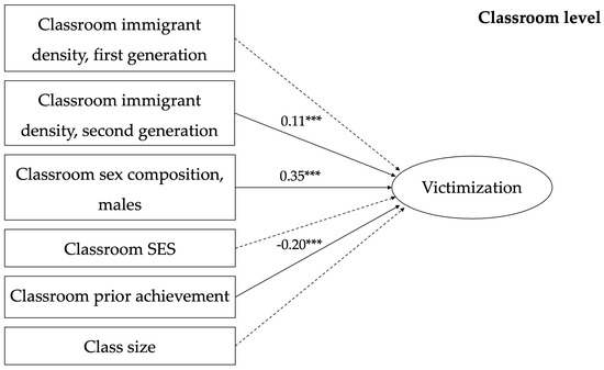 The results of the multilevel SEM analysis at the classroom level are shown in Figure 1. The findings revealed that a higher proportion of male students in the class was associated with higher levels of victimization (β = 0.35, SE = 0.01, p < 0.001). Similarly, classrooms with a higher percentage of second-generation immigrant students (β = 0.11, SE = 0.02, p < 0.001), but not first-generation students (β = 0.01, SE = 0.02, p = 0.34), reported higher levels of victimization. In contrast, classroom academic achievement was negatively associated with victimization rates (β = −0.20, SE = 0.02, p < 0.001), after controlling for students’ individual achievement: students with similar academic performance tended to report less victimization in classrooms with higher average achievement. Classroom SES (β = −0.02, SE = 0.02, p = 0.30) and class size (β = 0.03, SE = 0.01, p = 0.06) were not significantly associated with victimization. At the classroom level, the model explained 31.7% of the variance in victimization.