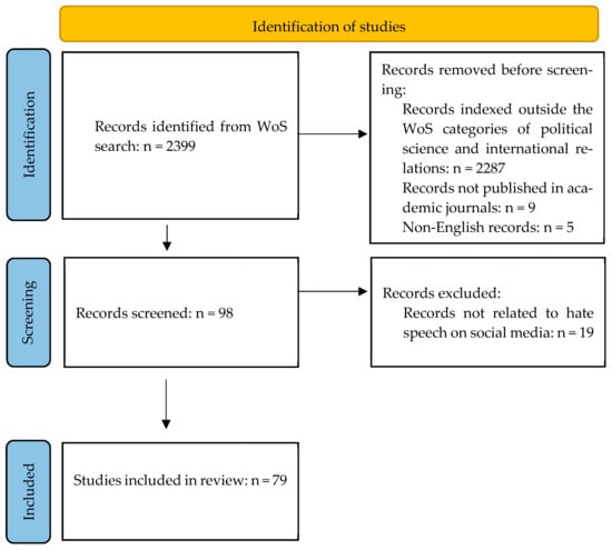 To focus solely on English-language publications, one Russian, two Italian, and two Spanish articles were excluded, narrowing the selection to 98. Limiting the review to English helped avoid inconsistencies in translation that could affect the interpretation of key concepts such as hate speech and racism, which often carry different meanings across languages. Also, covering non-English publications would have required extensive multilingual resources beyond the scope of this project. A further manual screening eliminated 19 articles that were unrelated to online hate speech. These articles appeared in the initial search because the keywords matched terms in the topic, title, journal name, abstract or keywords, but their content focused on topics like digital feminism or consent in childbirth, which are not directly relevant to hate speech on social media. The final dataset consists of 79 relevant articles, listed in Appendix A. Each article was analyzed for its contributions to three main areas: (1) drivers of online hate speech, (2) political consequences of such discourse, and (3) mitigation strategies proposed within the political science literature.