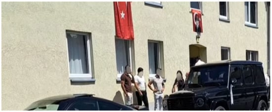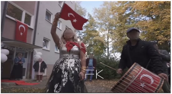 This dialectic between live action and digital augmentation prompts reflection on how ritual, memory, and identity are constructed in diaspora contexts. The use of Mehter music, evoking Ottoman military glory, alongside large Turkish flags and torches, creates a “fetih” (conquest) aesthetic that superimposes domestic events with epic connotations. This notion of conquest is not intended for geopolitical purposes, nor does it claim territorial space directly. Instead, it operates symbolically, representing diaspora, visibility, cultural continuity, and communal pride. The conquest aesthetic transforms a private ritual into a performance of strength and lineage; although Mehter music is added post-production and is not heard by local spectators, it still connects the ritual to a glorified imperial past, imbued with honour and power. Consequently, it seeks to convey and evoke feelings of resilience, strength, and loyalty among Turkish migrants, despite the negative experiences associated with migration. It also serves as an expression of their presence, incorporating national codes (Karamese 2017). By employing the conquest aesthetic—such as flags, torches, and Mehter music—the Turkish migrants temporarily reconstruct the public environment with essential symbols of their identity, claiming visibility, belonging, and an emotional presence in public space to express their cultural identity and seek recognition.
