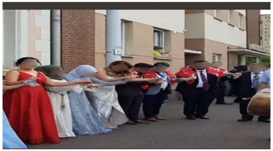 Furthermore, De Certeau’s ([1984] 1996) notion of “tactics of everyday life” is vital for comprehending the nuanced ways in which these rituals function as practices of resistance. In contrast to overt political actions, De Certeau’s tactics are everyday, yet strategic, manoeuvres through which subordinate groups reclaim space, visibility, and meaning in contexts not of their own creation (Karamese 2023). When viewed through this lens, Turkish-German weddings emerge not merely as cultural reproductions but as tactical interventions within the public sphere—rituals that re-signify space and identity without directly challenging dominant power structures.