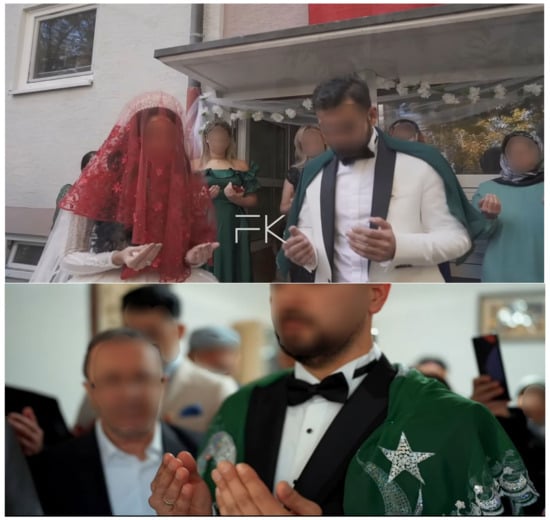 Moreover, Fadil (2011) underscores the negotiated nature of public religious expression in Europe, particularly within Muslim communities. According to Fadil, these expressions are not static replications of tradition; rather, they are ethically and politically mediated practices shaped by migrants’ interactions with dominant secular norms. This aspect is evident in Turkish-German wedding rituals, where the hybridisation of religious and secular symbols occurs—exemplified by the juxtaposition of Ottoman motifs, Quranic calligraphy, and Islamic prayers alongside Western-style banquet settings, white dresses, and European music.