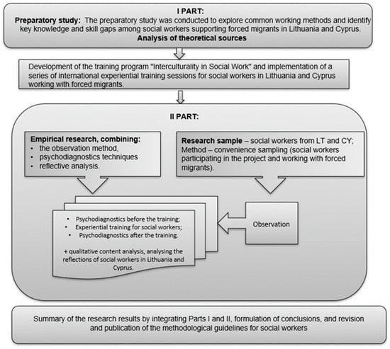 The article presents research findings obtained during the implementation of the international project “Enhancing Intercultural Communication Competences for Social Workers in the Provision of Assistance to Forced Migrants” No. 2023-1-LT01-KA210-ADU-000151010, funded by the EU Structural Fund Erasmus+. The project was carried out from 1 December 2023 to 31 December 2024 in Lithuania and Cyprus. It is important to note that the project’s funding had no influence on the conduct of the research or the integrity of its results. The research design is presented in Figure 1.