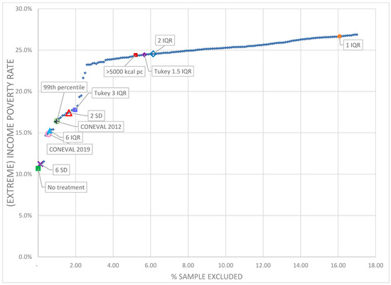 Interestingly, the exclusion of the top percentile of the AC distribution produces results that closely align with those obtained under Mexico’s official poverty measurement methodology in 2012, despite differences in the criteria used. In contrast, the exclusion of values greater than six standard deviations from the mean has virtually no effect on the poverty rate, indicating that such a rule is too lenient and fails to meaningfully address the presence of extreme values. Standard deviation and percentile-based thresholds are highly sensitive to the distribution of the data. Given that similar results can be achieved using less distribution-sensitive methods, we argue that these rules do not meaningfully enhance the accuracy of poverty measurement and should generally be avoided.