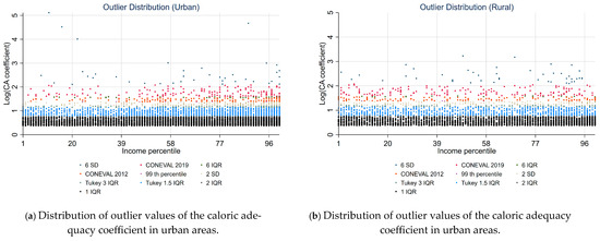 Location of the extreme values of the caloric adequacy coefficient across the percentiles of per capital household income in urban and rural areas, Mexico, 2026. Notes: The y-axis is expressed in natural logarithms. Only outlying observations are included, considering the different decision rules described in Table 1. Stricter criteria (colors at the top of the Y-axis) identify a smaller set of outliers. As more relaxed criteria are applied (colors at the bottom), the number of detected cases increases, but cumulatively: all outliers flagged by stricter criteria are also included under the more relaxed ones. Source: Authors’ calculations using ENIGH 2016 data (INEGI 2017).