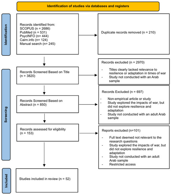 This review sought to synthesize findings from empirical studies. These include cross-sectional, longitudinal, qualitative, experimental, quasi-experimental, and case-study designs. The literature search covered publications from 2000 to 2025, ensuring that the review captures insights into resilience and adaptation from relatively recent wars in the Arab world. Studies published in Arabic, English, and French were included, as these are the most prevalent languages used among Arab scholars (Elgamri et al. 2024; Ashoor and Chaudhry 1993).