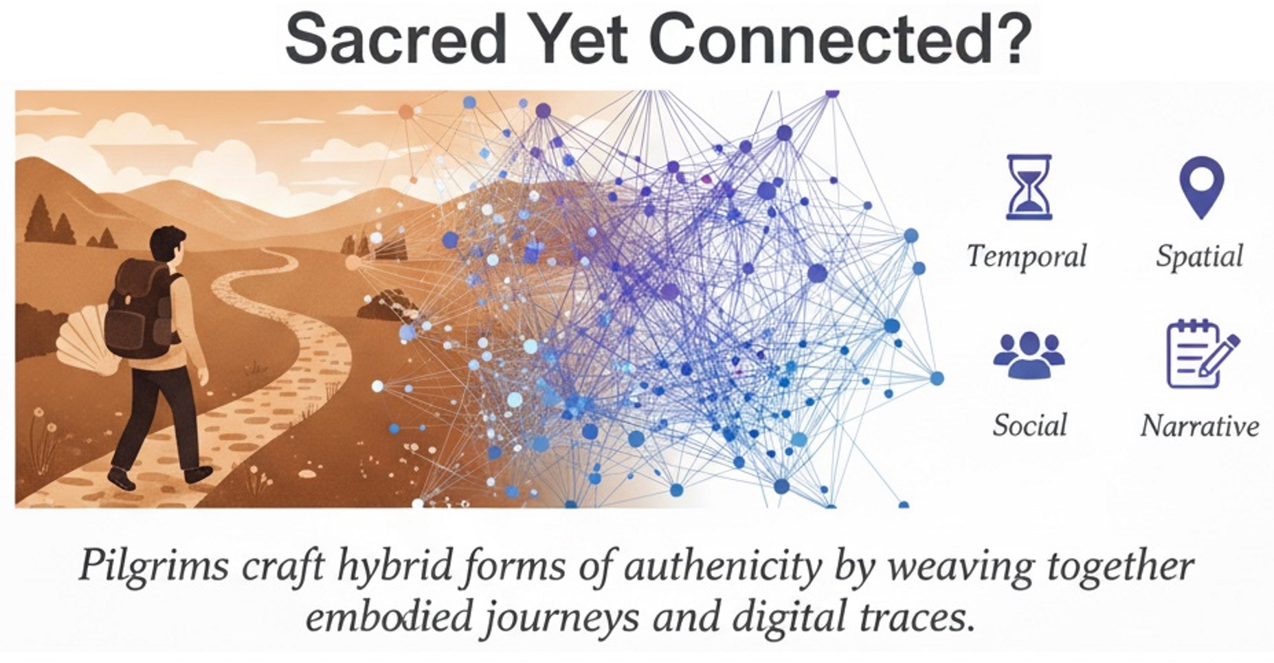 The proliferation of smartphones and social media has intensified debates about authenticity in contemporary pilgrimage, with critics arguing that digital connectivity undermines the spiritual depth of sacred journeys. This article explores how pilgrims on the Camino de Santiago negotiate this tension, asking whether digital mediation necessarily diminishes authentic experience. Through ethnographic fieldwork in Santiago de Compostela, semi-structured interviews with 20 pilgrims, and digital ethnography of online forums and social media platforms, the study identifies four interconnected ‘digital authentication strategies’: temporal regulations (when to connect/disconnect), spatial restrictions (where technology is appropriate), social negotiations (group norms), and narrative curation (selective digital storytelling). Rather than abandoning technology or experiencing diminished authenticity, pilgrims develop reflexive practices that integrate physical and digital dimensions while maintaining subjective experiences of spiritual legitimacy. These findings challenge classical anthropological models positioning pilgrimage as total separation from everyday life. Instead, contemporary pilgrims inhabit ‘connected liminality’—a digitally mediated liminal state where transformation occurs amid continuous connectivity, and where authenticity emerges through attentional discipline rather than technological absence. Digital mediation thus operates not as contamination but as transformation, creating hybrid ritual forms that reflect broader shifts in late modern religiosity.