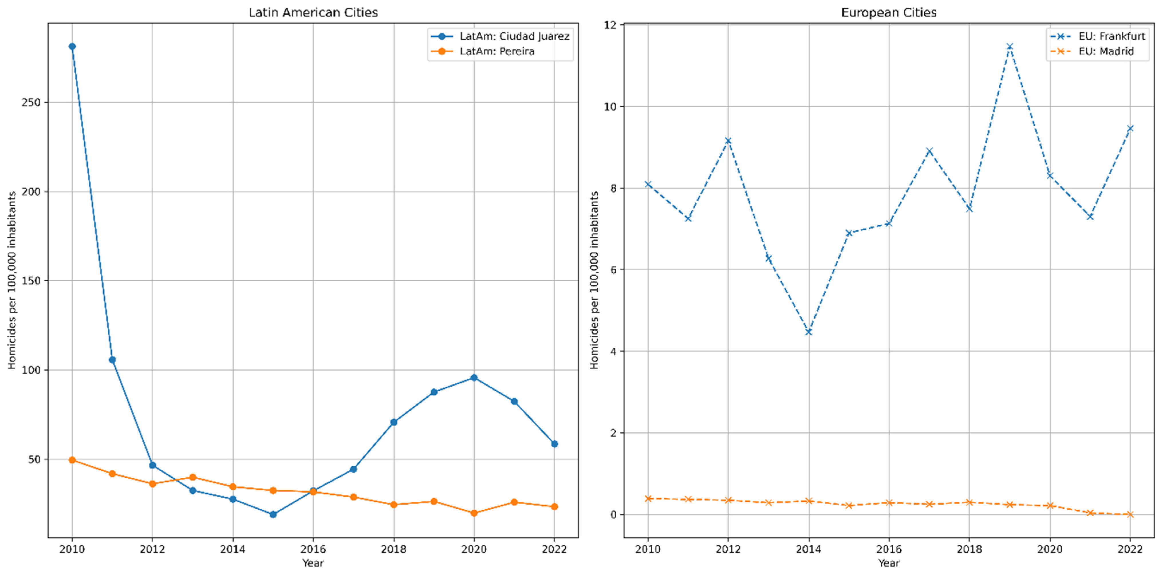 Between 2010 and 2022, Ciudad Juárez emerged as the most violent city, with an average of 75.62 homicides per 100,000 inhabitants. Pereira followed with an average rate of 33.09 homicides per 100,000 inhabitants, while Frankfurt and Madrid exhibited substantially lower rates at 5.16 and 0.39 homicides per 100,000 inhabitants, respectively (