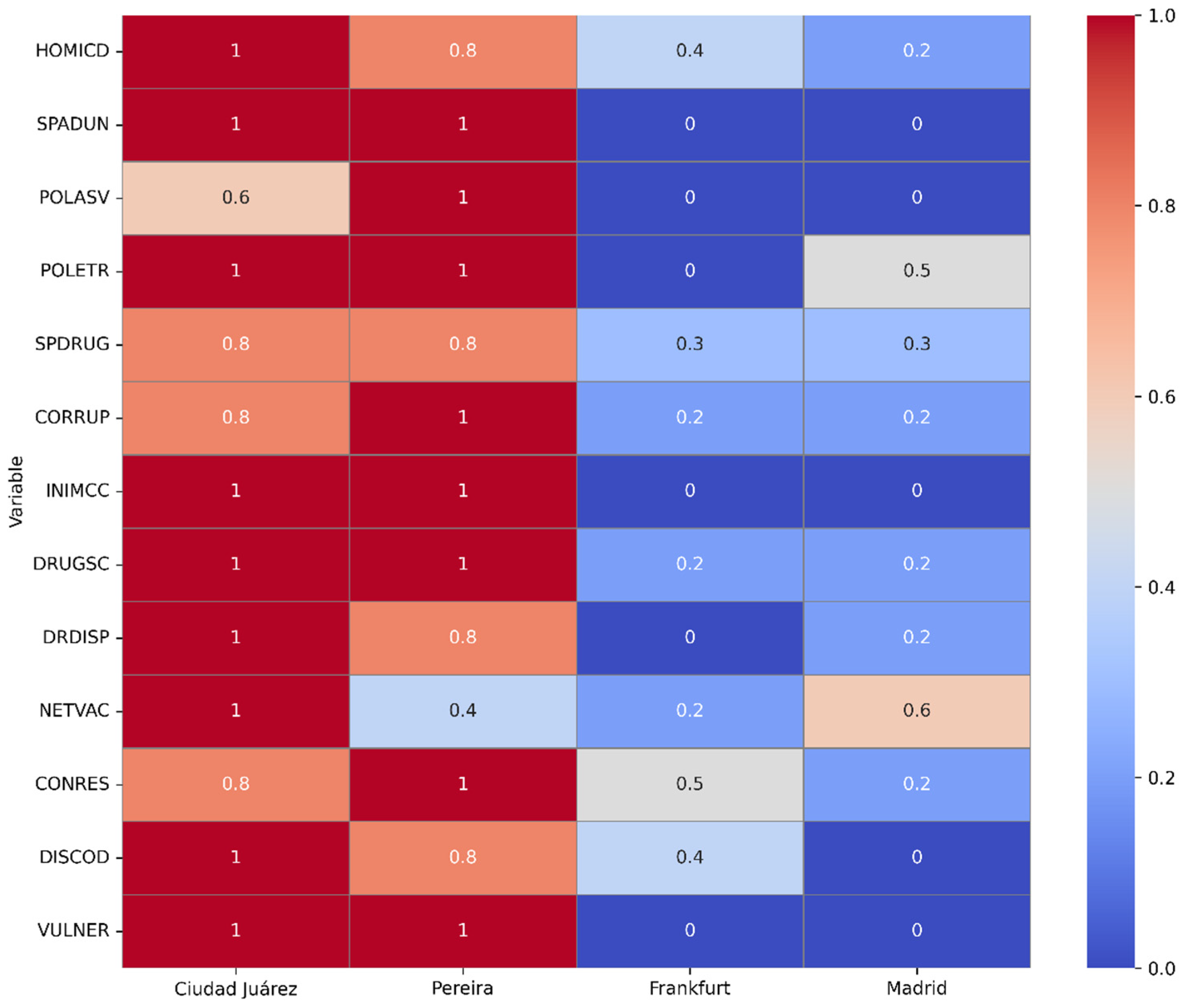 The selection of four cities—Ciudad Juárez, Pereira, Madrid, and Frankfurt—was designed to capture diverse roles in the global cocaine market. While these cities are not directly connected within a single supply chain, they represent key points in production, transit, distribution, and consumption. This comparative framework allowed us to explore how systemic violence manifests differently depending on the local configurations of institutional, market, and social conditions. Although homicide rates were used as an outcome variable, we recognize that they are an incomplete proxy for violence. Future studies should incorporate additional metrics, such as extortion or disappearances, to provide a broader perspective on organized crime violence.
