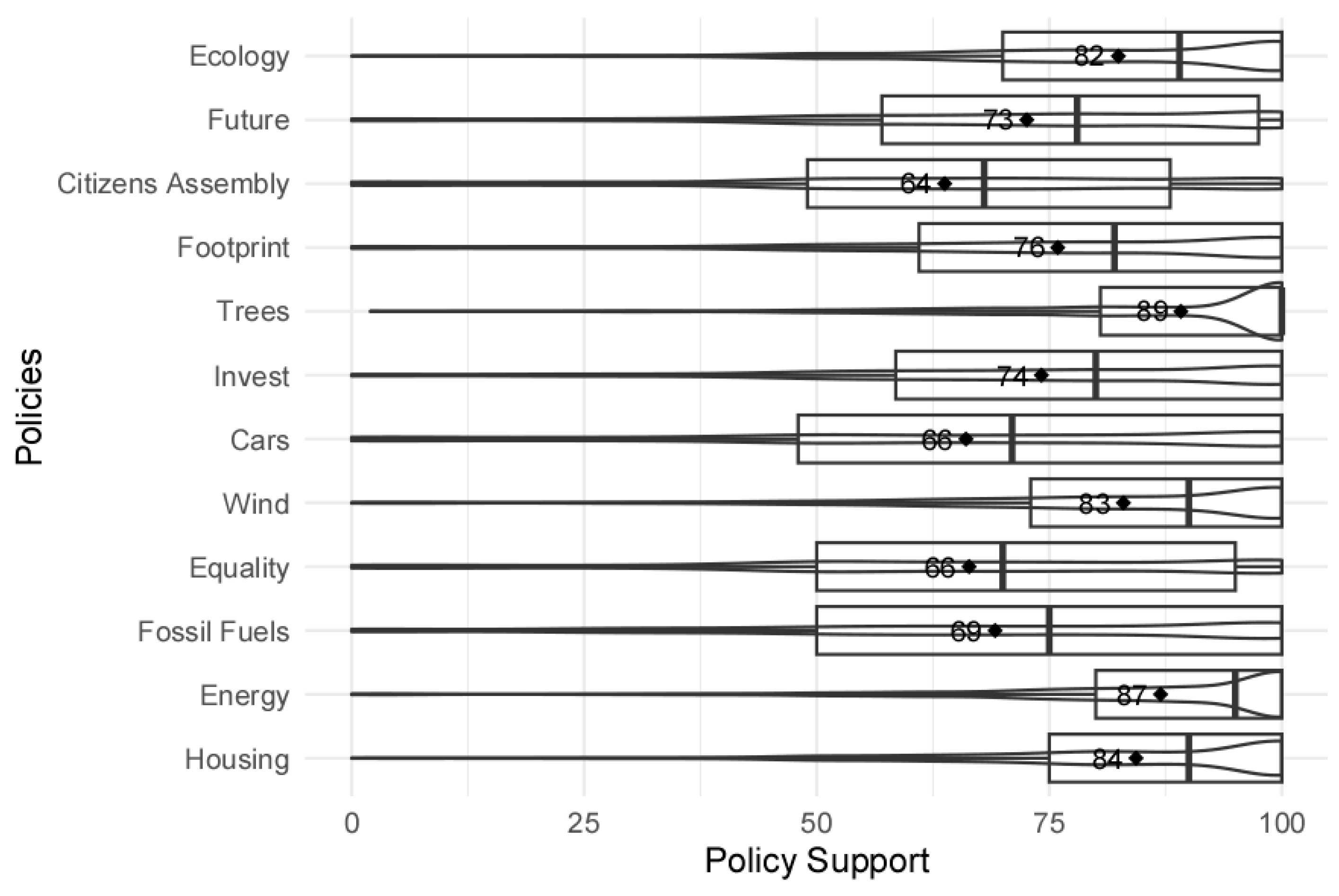 Figure 1. Level of Support for each Environmental Policy. The central line in the boxplot for each policy shows the median and the extents are the 25th and 75th percentiles. ♦ = Mean support. Policy descriptions are presented in the Supplemental Material Table S3. See Supplemental Material S4 Figures S1 and S2 for results separated by survey.